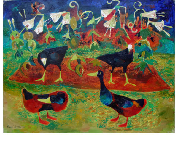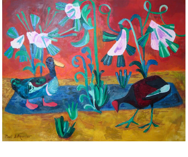Duck and Moorhen with Orange Flowers Oil on Canvas 28” x 36”