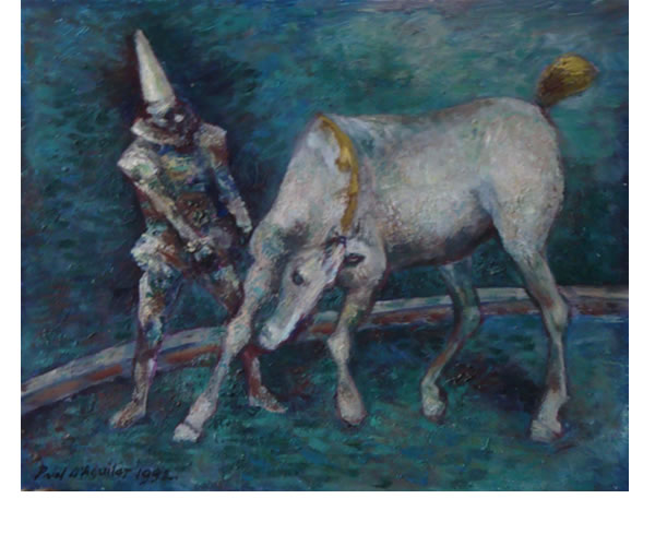 Clown and Wilful Horse Oil on Board 20” x 24”