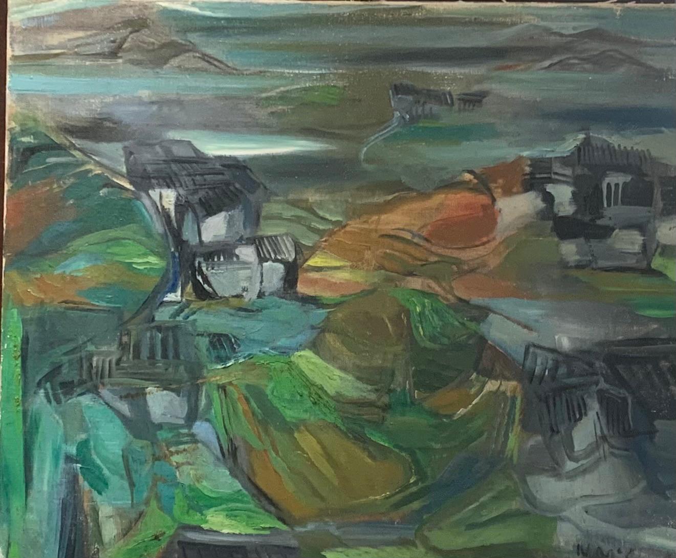 Norah McGuinness was a landscape painter, designer and illustrator born in Derry. In spite of disapproval from her family, she attended the Dublin Metropolitan school of Art where she won a scholarship. In 1924, she was awarded a medal for her drawings entered in the Tailteann competition after which she held her first exhibition at the Royal Hibernian Academy. McGuinness continued her education at the Chelsea Polytechnic for several months. A founding member of the Irish Exhibition of Living Art, she also served as president from 1944 to 1971.